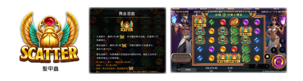 通常在大獎開出前後,聖甲蟲SCATTER符號的出現頻率會明顯增加,即使這些符號出現,卻不一定能夠進入免費遊戲,這與機率工程師設定同時出現幾個聖甲蟲SCATTER符號有關,但出現之後,玩家可以試著買進總資金 20% 至 25% 的總額買進免費遊戲,會有賺 20 到上千倍的機率。